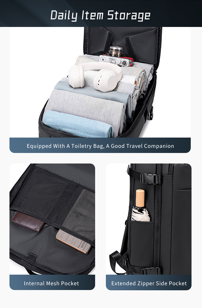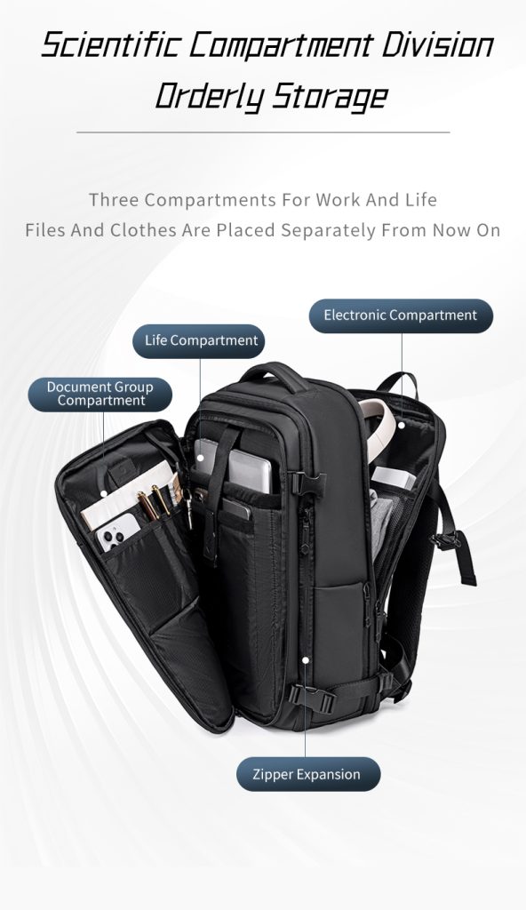 طراحی گسترشپذیر – از یک کولهپشتی روزمره به یک کیف مسافرتی بزرگ تبدیل میشود. تا ۸ سانتیمتر عمق اضافه برای حمل وسایل بیشتر.