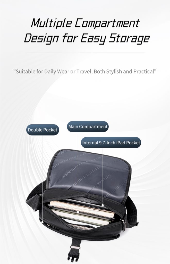 کیف دارای سه بخش سازماندهیشده است: یک محفظه اصلی برای گوشی و اشیاء کوچک با بخش زیپی برای وسایل باارزش، و بخشهای جلویی و پشتی که امکان دسترسی سریع به لوازم روزمره مانند پاوربانک، هندزفری، عینک و شارژر را فراهم میکنند.